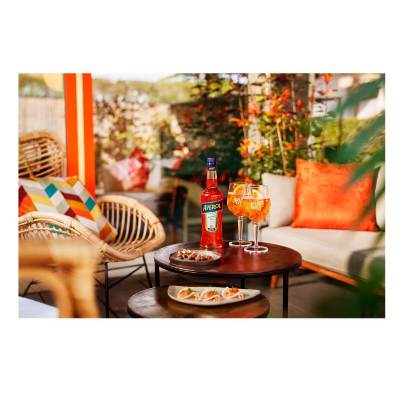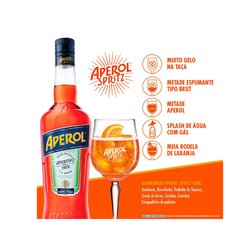 Aperol Spritz é o autêntico drink italiano. Criado em 1919 e com uma receita inalterada até hoje, o Aperol tem baixo teor alcoólico (11%). Aperol Spritz é a bebida ideal para todas as ocasiões sociais, para os momentos de convívio com amigos e colegas. Seu sabor marcante de laranja levemente adocicado, fazem com que Aperol seja o acompanhamento perfeito para um dia de sol, um happy hour ou até mesmo em uma reunião informal em casa ou onde preferir.