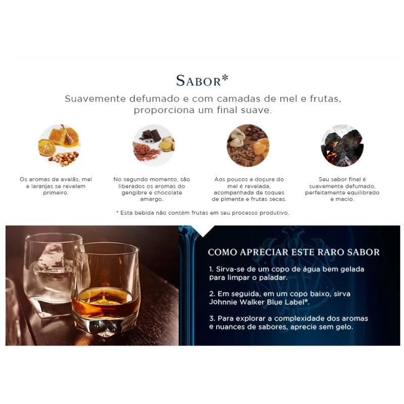 John e Alexander Walker trabalharam com os melhores e mais raros whiskies que seriam usados na composição do Johnnie Walker Blue Label. Não é usado um número fixo de maltes na sua composição e nem tampouco existe uma idade mínima de envelhecimento. Em sua produção, o master blender usa os maltes mais raros que existem na Escócia e de características marcantes. O que realmente importa é a raridade de seus maltes, e é por esse motivo que sua disponibilidade é tão limitada. Possui aroma doce amadeirado, cravo-da-índia, doce de manteiga e sabor rico com mel.