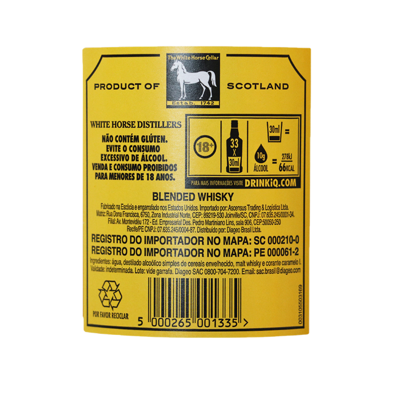 Whisky escocês. White Horse é composto por mais de 35 maltes, uma das mais elevadas proporções de maltes nos scotch whiskies. Assim como Logan, também desenvolvido por Peter Mackie, seus principais maltes são Lagavulin, Glen Elgin e Craigellachie. White Horse foi um dos primeiros scotch whiskies a serem introduzidos no Brasil, e traz até hoje o mesmo sabor, rico e úmido, e a mesma qualidade, aqui e no mundo inteiro.